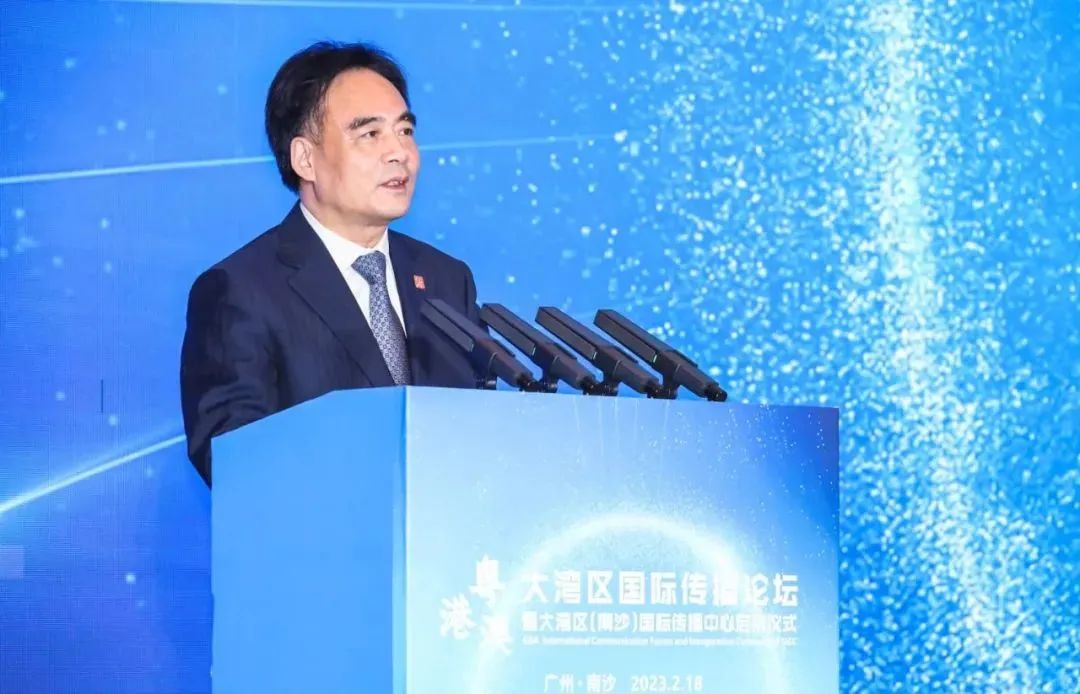Lu Cairong, vice president of China International Communications Group (CICG), speaks at the GBA International Communication Forum held in Nansha district of Guangzhou, southern China's Guangdong province, on Feb. 18, 2023. [Photo/CICG]