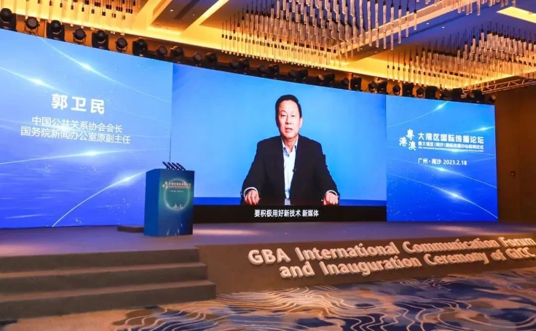 Guo Weimin, president of the China Public Relations Association and former vice minister of China's State Council Information Office, speaks via video at the GBA International Communication Forum held in Nansha district of Guangzhou, southern China's Guangdong province, on Feb. 18, 2023. [Photo/CICG]