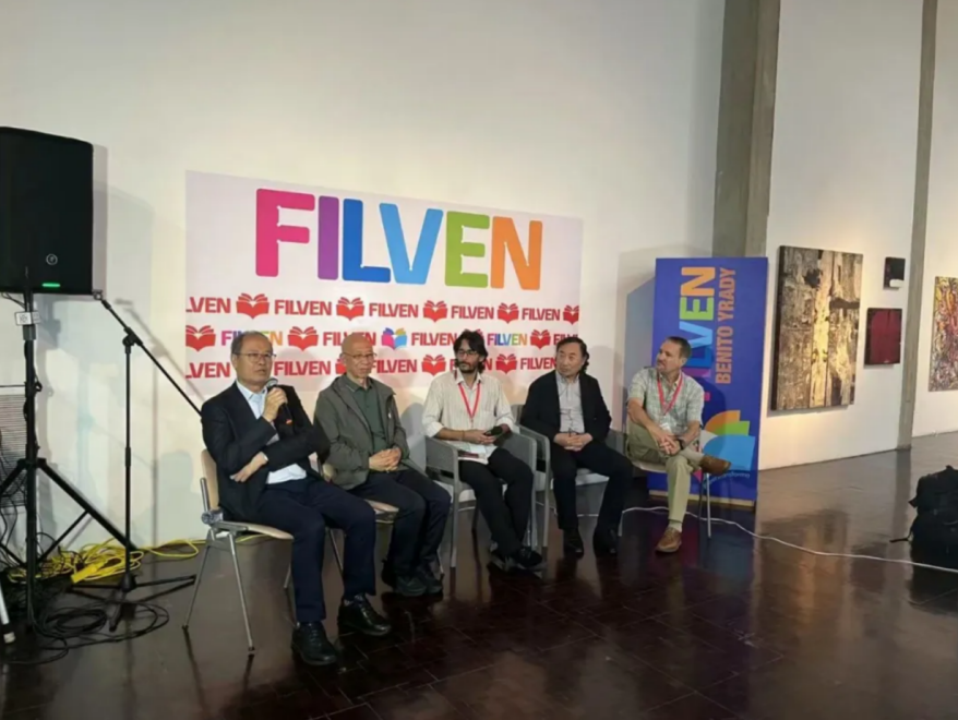 Yang Zhijun (L2), author of "The Elephants" attends the 2024 International Book Fair of Venezuela in Caracas, Venezuela, July 12, 2024. [Photo/CICG]