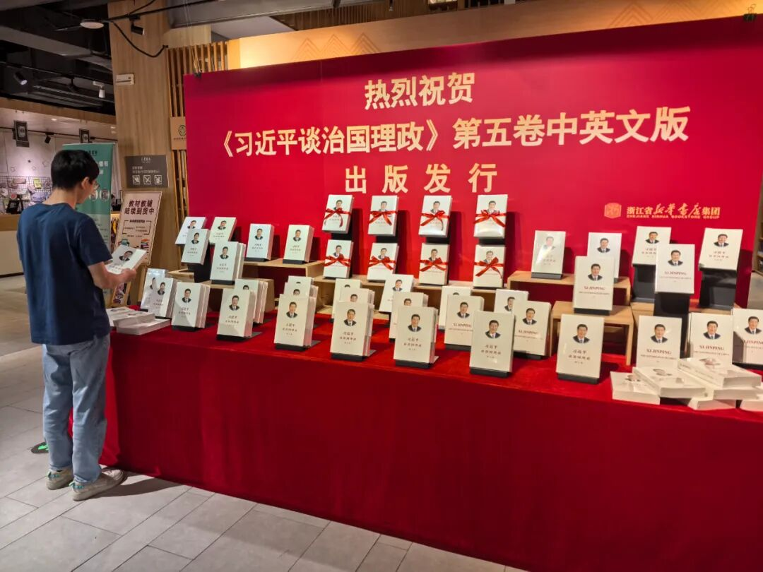 The fifth volume of "Xi Jinping: The Governance of China" is on display at a bookstore in Zhuhai, Guangdong province, in August 2025. [Photo/CICG]