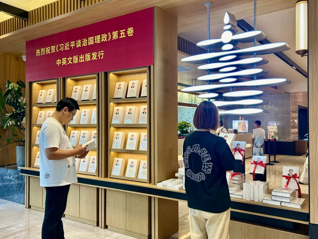 The fifth volume of "Xi Jinping: The Governance of China" is available at Qingchun Road Book Center in Hangzhou, Zhejiang province, in August 2025. [Photo/CICG]