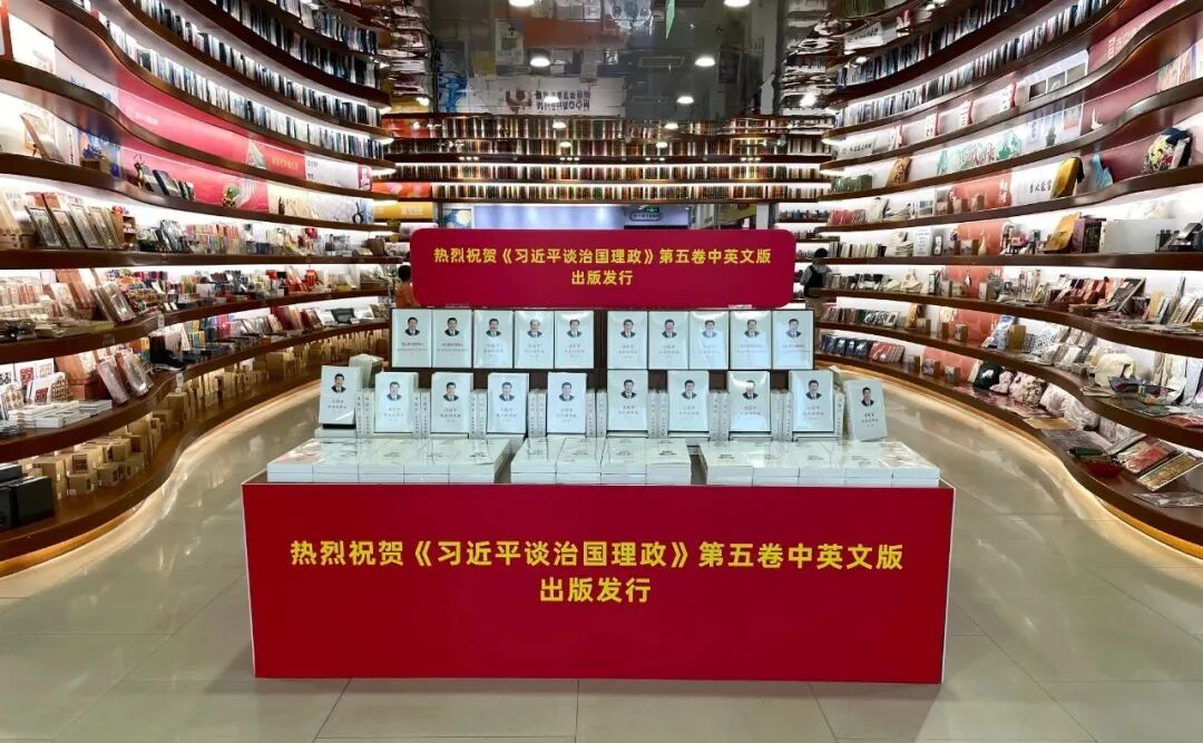 The fifth volume of "Xi Jinping: The Governance of China" is available at Xinhua Bookstore (Zhongshan Branch) in Xiamen, Fujian province, in August 2025. [Photo/CICG]