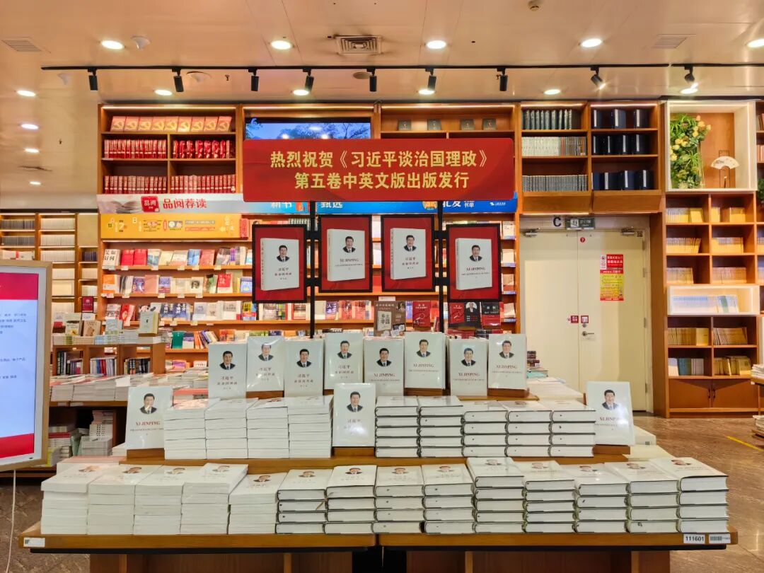 The fifth volume of "Xi Jinping: The Governance of China" is available at Wangfujing Bookstore in Beijing in August 2025. [Photo/CICG]