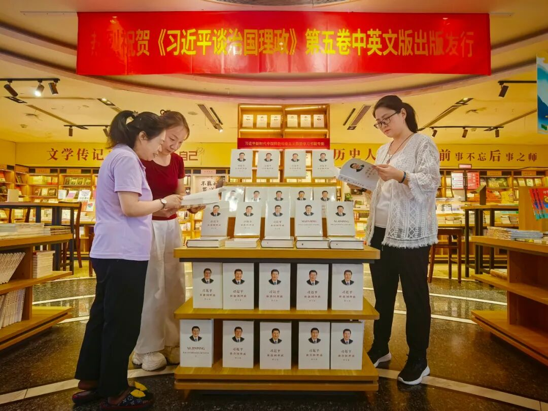 The fifth volume of "Xi Jinping: The Governance of China" is available at Yayuncun Books Building in Beijing in August 2025. [Photo/CICG]