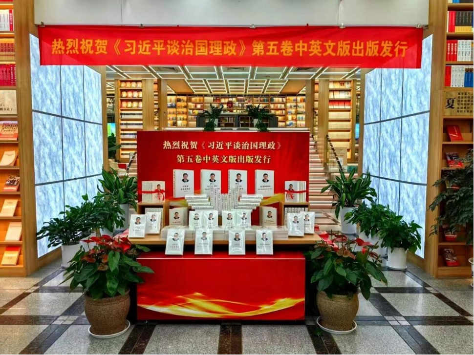 The fifth volume of "Xi Jinping: The Governance of China" is available at a Xinhua Bookstore in Nanjing, Jiangsu province, in August 2025. [Photo/CICG]