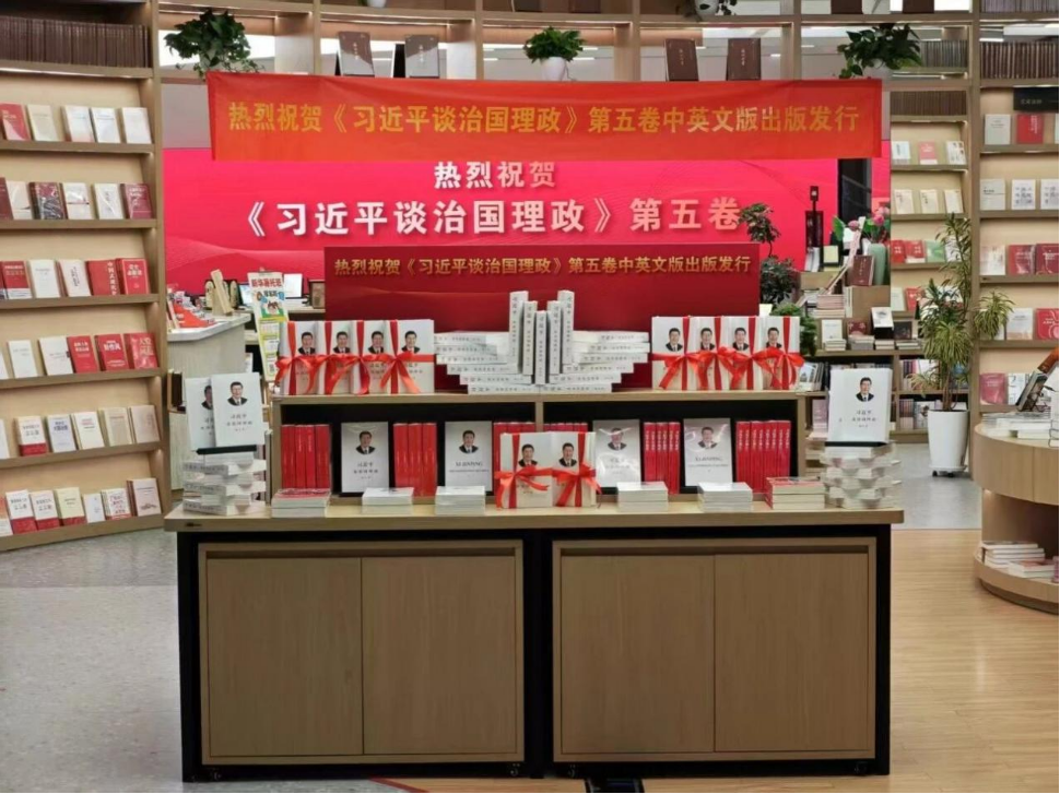 The fifth volume of "Xi Jinping: The Governance of China" is on display at Xinhua Bookstore (Guanqian Branch) in Suzhou, Jiangsu province, in August 2025. [Photo/CICG]