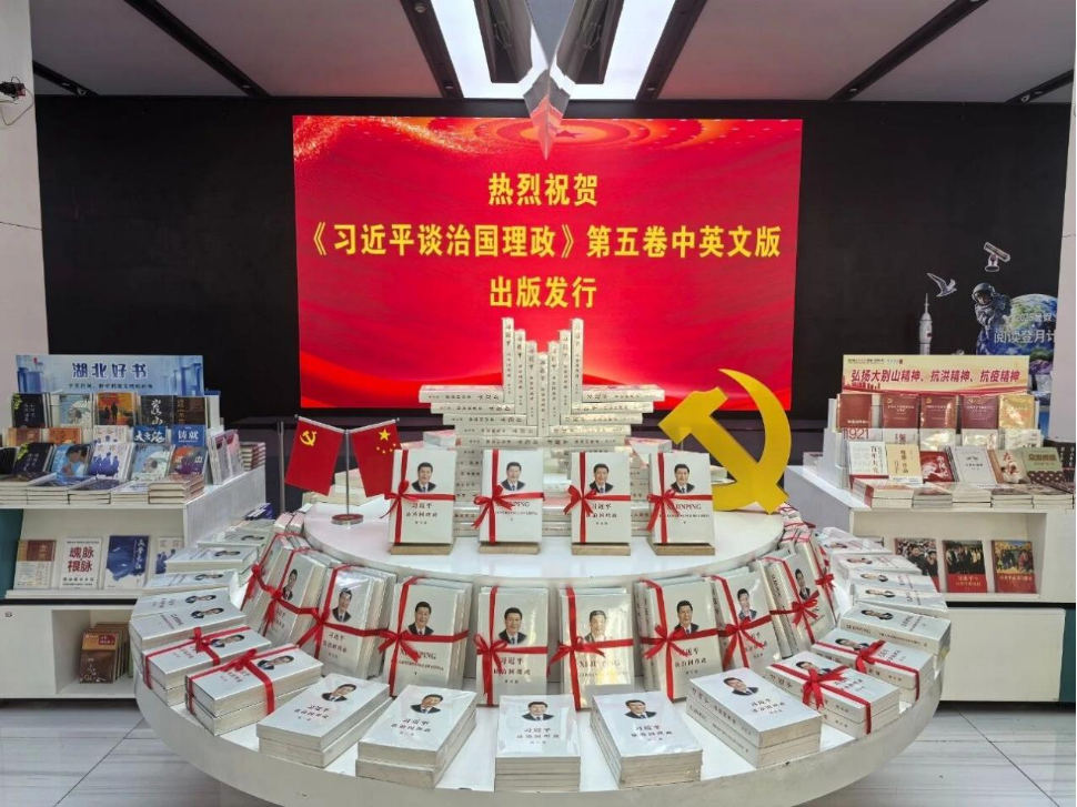 The fifth volume of "Xi Jinping: The Governance of China" is on display at Hubei Foreign Language Bookstore in Wuhan, Hubei province, in August 2025. [Photo/CICG]