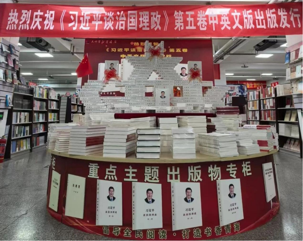 The fifth volume of "Xi Jinping: The Governance of China" is available at a Xinhua Bookstore in Xining, Qinghai province, in August 2025. [Photo/CICG]