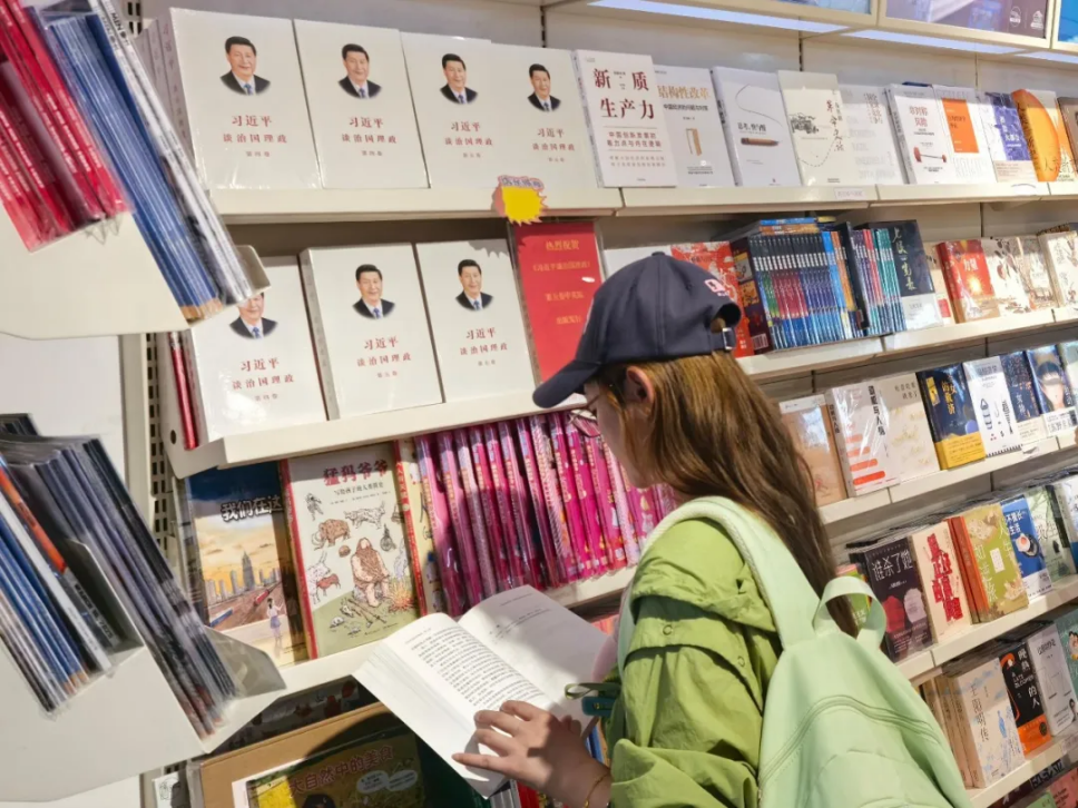 The fifth volume of "Xi Jinping: The Governance of China" is available at a bookstore at Nanjing South Railway Station in August 2025. [Photo/CICG]