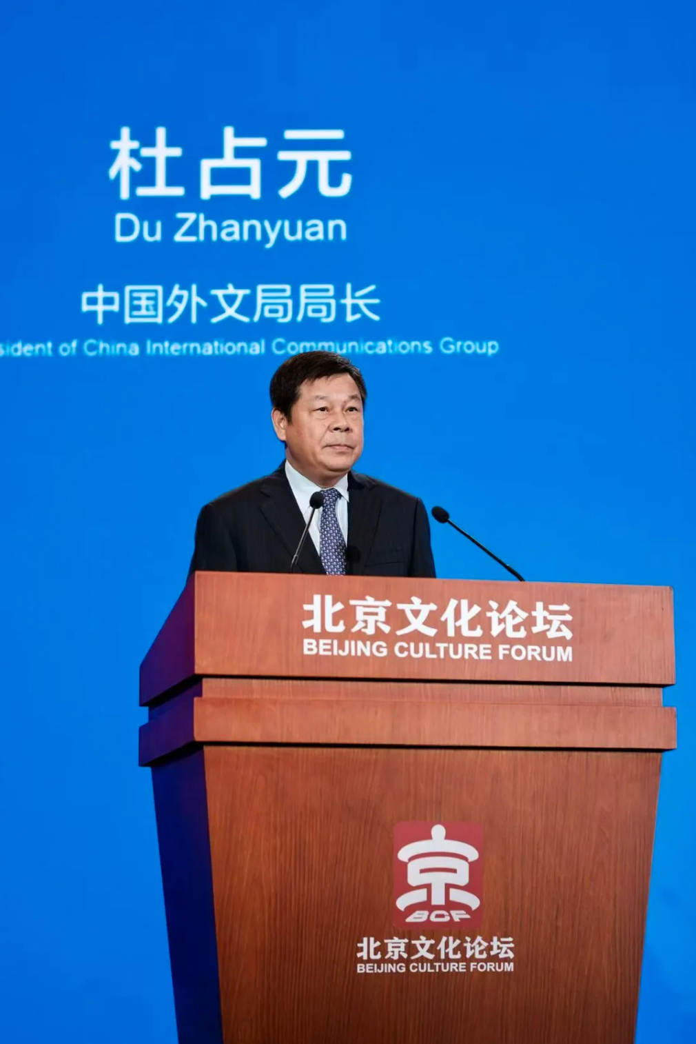 Du Zhanyuan, president of China International Communications Group (CICG), introduces the "Report on China's Cultural Exchanges with the World (2024)" at the opening ceremony of the 2025 Beijing Culture Forum on Sept. 23, 2025. [Photo/CICG]