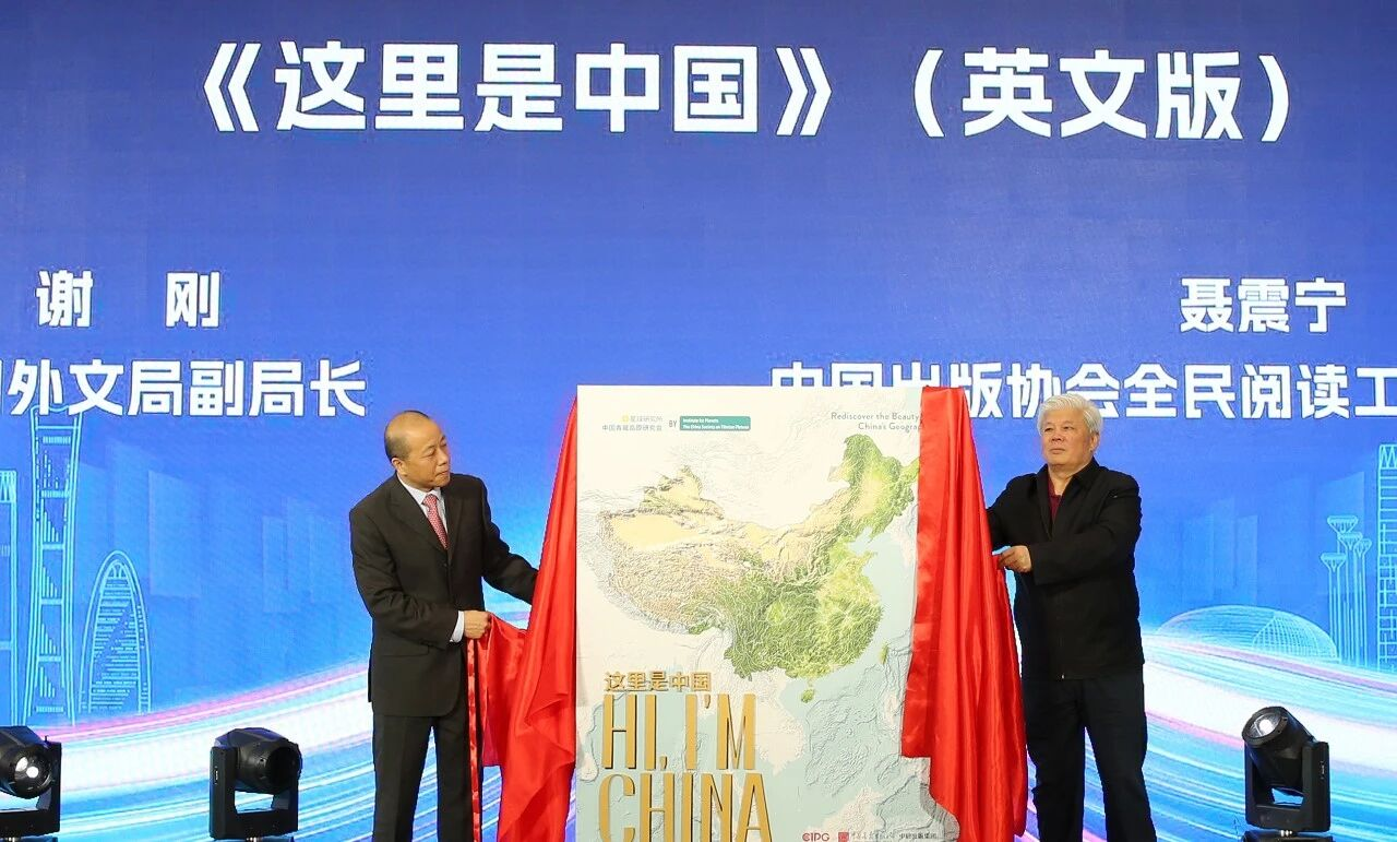 Xie Gang (L), vice president of China International Communications Group (CICG), and Nie Zhenning, director of the national reading committee of the Publishers Association of China, unveil the English edition of "Hi, I'm China" at Beijing Library, Sept. 29, 2025. [Photo/CICG]