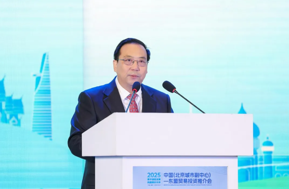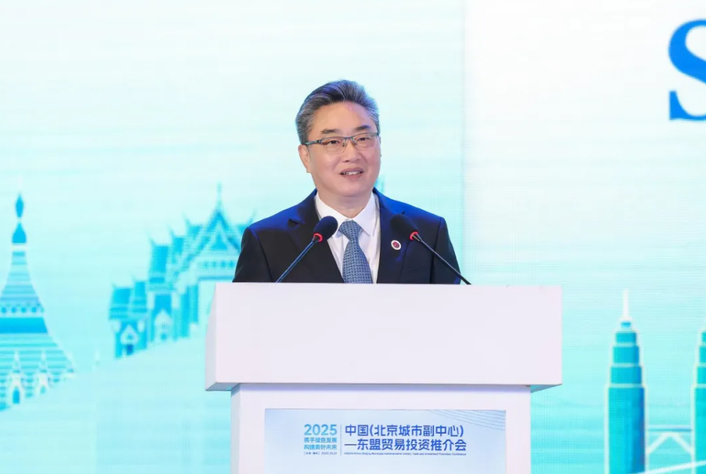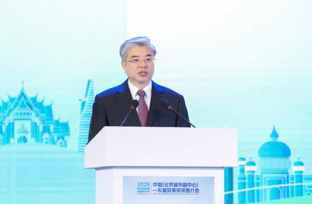 ASEAN-China Centre Secretary-General Shi Zhongjun delivers a speech at the ASEAN-China (Beijing Municipal Administration Center) Trade and Investment Promotion Conference in Beijing's Tongzhou district, Oct. 21, 2025. [Photo/CICG]