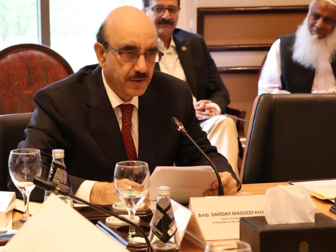 Masood Khan, former permanent representative of Pakistan to the U.N. and former Pakistani ambassador to China, delivers remarks at the China-Pakistan Think Tank Dialogue 2025 in Islamabad, Oct. 19, 2025. [Photo/CICG]