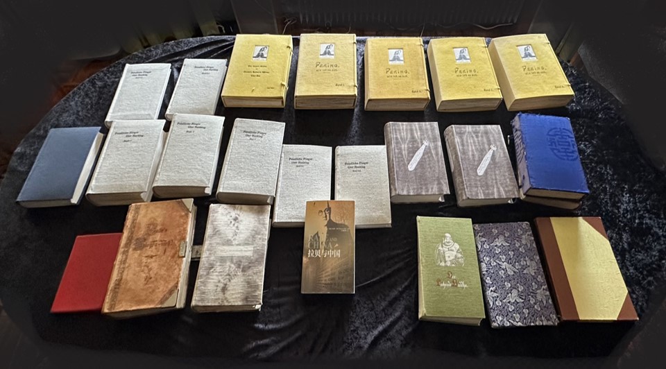 A display featuring John Rabe's published works alongside Thomas Rabe's latest book'Rabe and China' at the John Rabe Communication Center in Heidelberg. [Photo provided by Thomas Rabe]