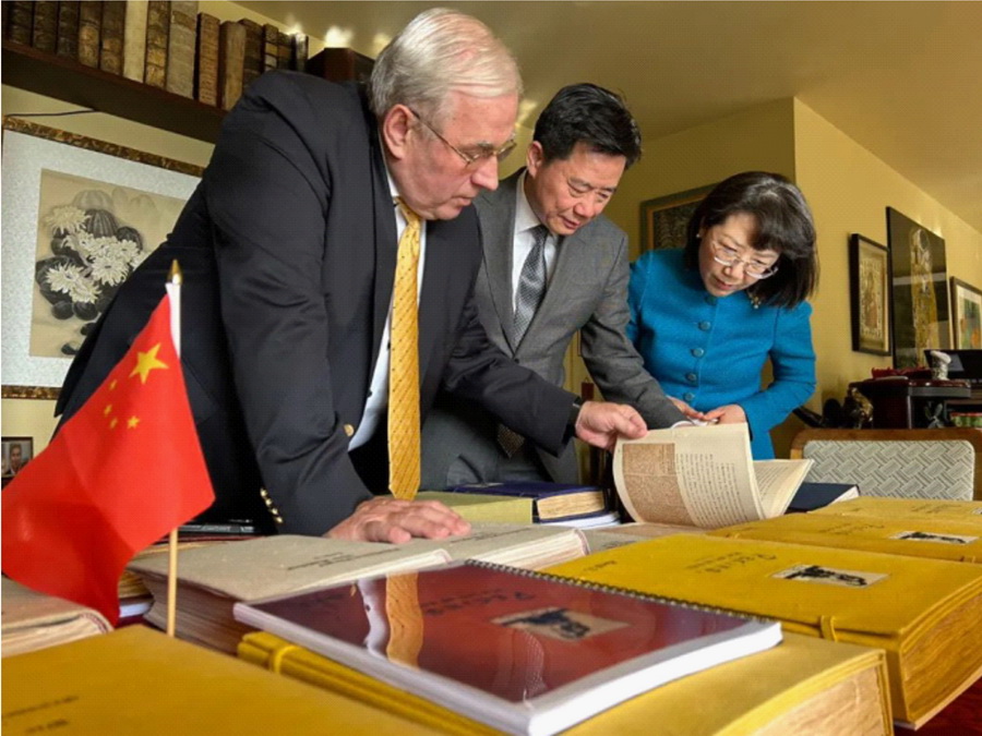 Thomas Rabe presents historical materials to then-Chinese ambassador to Germany Wu Ken (C) and his wife during a visit to the John Rabe Communication Center in Heidelberg, March 14, 2023. [Photo provided by Thomas Rabe]