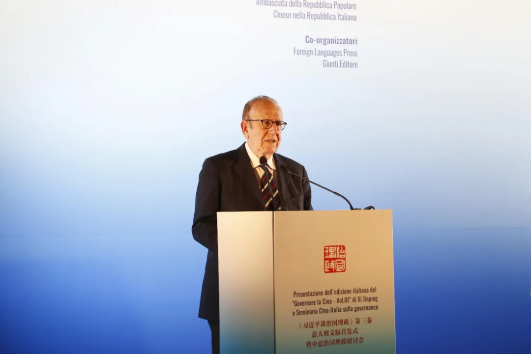 Pino Arlacchi, former U.N. under-secretary-general, delivers a speech at the launch event for the Italian edition of the third volume of "Xi Jinping: The Governance of China" in Rome, Italy, Nov. 13, 2025. [Photo/CICG]