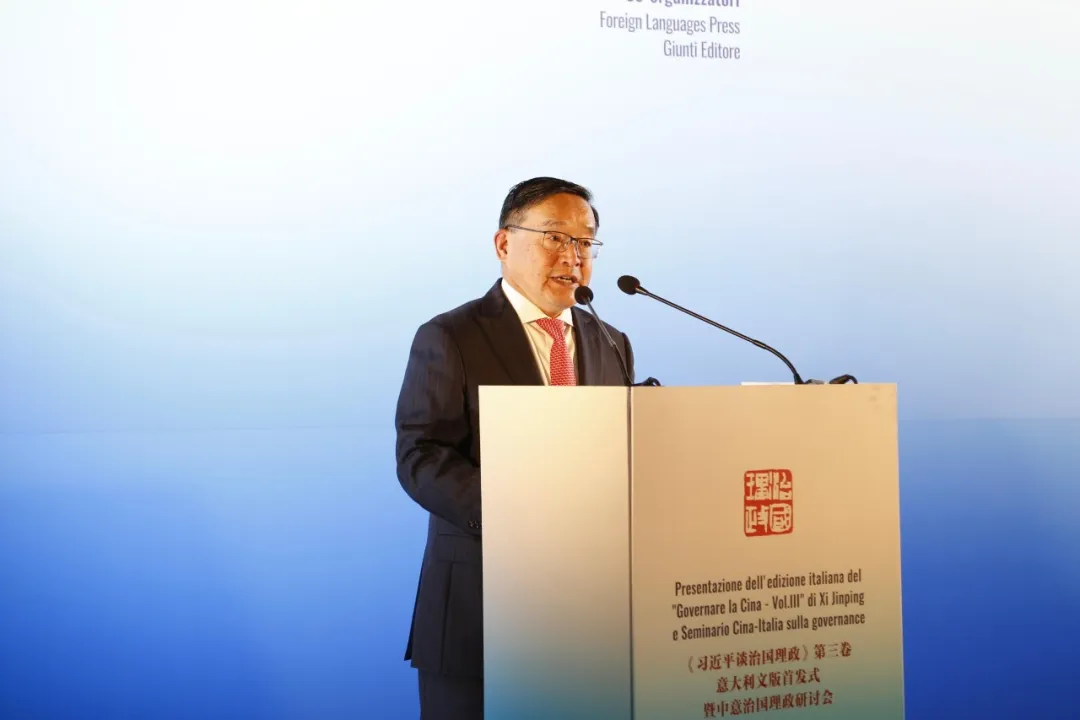 Jia Guide, Chinese ambassador to Italy, delivers a speech at the launch event for the Italian edition of the third volume of "Xi Jinping: The Governance of China" in Rome, Italy, Nov. 13, 2025. [Photo/CICG]