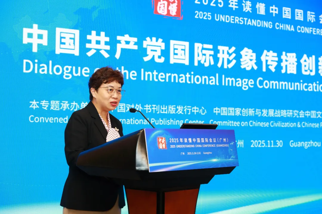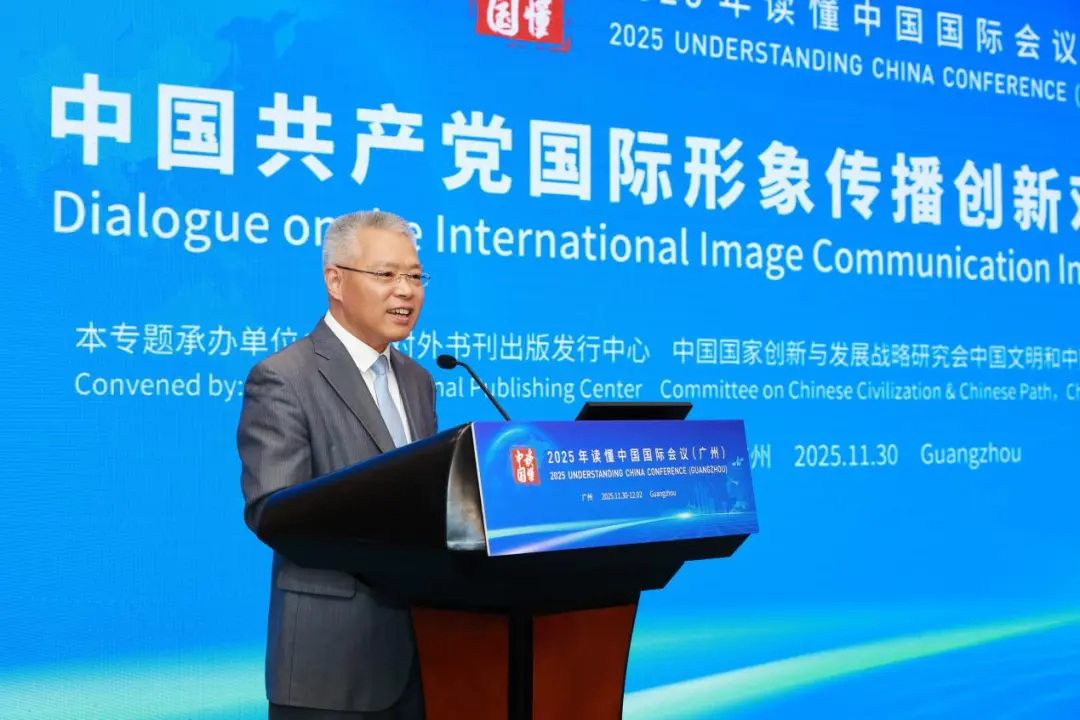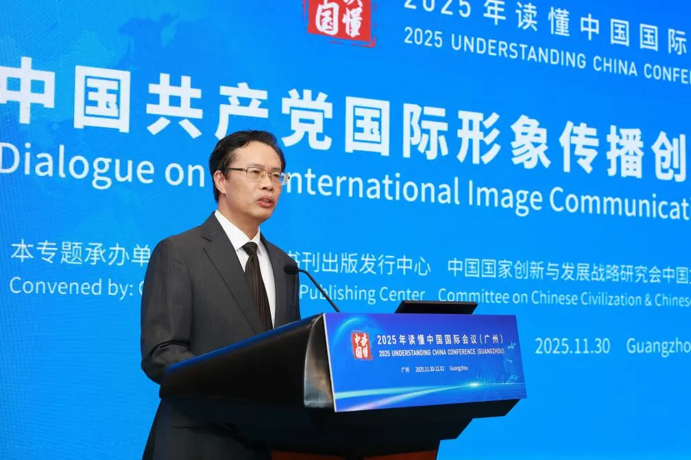Yu Yingfu, vice president of China International Communications Group (CICG), delivers a speech at the Dialogue on the International Image Communication Innovation of the CPC in Guangzhou, Guangdong province, Nov. 30, 2025. [Photo/CICG]