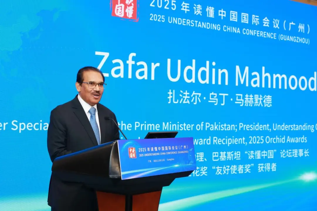 Zafar Uddin Mahmood, former special assistant to the prime minister of Pakistan, delivers a speech at the Dialogue on the International Image Communication Innovation of the CPC in Guangzhou, Guangdong province, Nov. 30, 2025. [Photo/CICG]