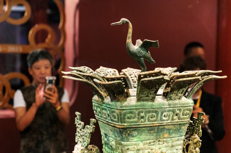Notable exhibits in this section include a bronze lotus-crane square pot from the Spring and Autumn Period (770-476 B.C.), the Golden Chalice of Eternal Stability used by emperors at the ceremony for handwriting on Chinese New Year during the Qing Dynasty, as a way to pray for a promising future for the nation, and a jade cong (tube) from the Liangzhu Culture which testifies to ancient knowledge of the universe and earth.