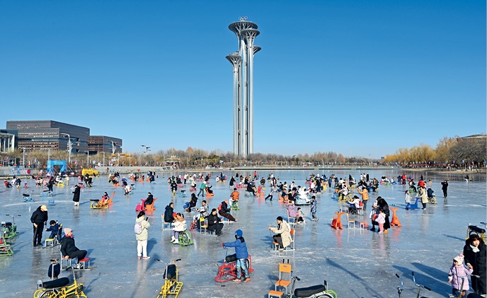 Citizens have fun playing on ice carts at the dragon-shaped waterway ice rink in Beijing's Olympic Park, on January 3, 2026.