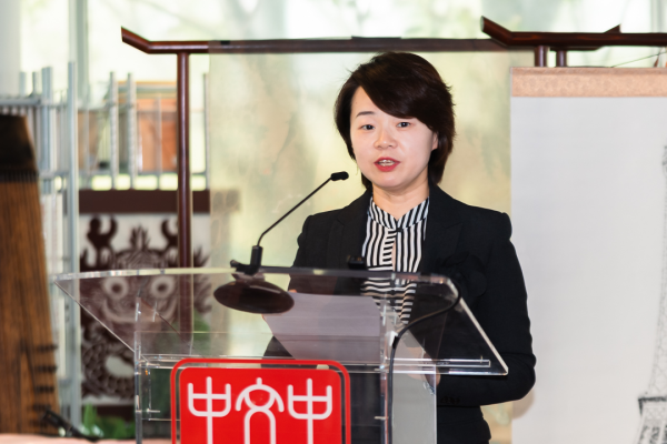 Zhu Xiaoyun, deputy director of the China Cultural Center in Paris, speaks at a dialogue on cultural exchange in Paris, France, April 17, 2026. [Photo/CICG]